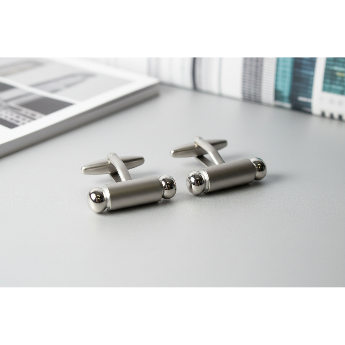 Pair of silver cufflinks on a light gray background